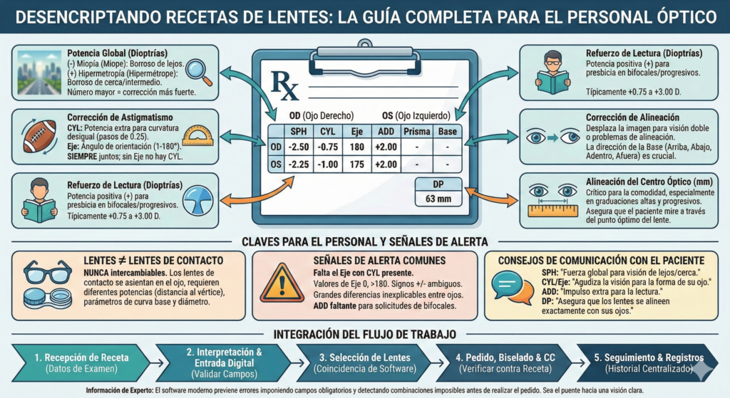 - Las recetas contienen 5-7 campos esenciales: ESF, CIL, Eje, ADD, Prisma, Base y DP—cada uno con una función óptica específica