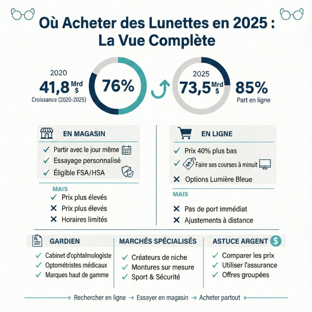 Ce n’est plus l’expérience d’achat de lunettes de vos grands-parents. Le marché nord-américain des lunettes connaît une croissance annuelle de 5,12 %, tandis que les ventes en ligne explosent à 5,8 % par an. Que vous ayez besoin de lunettes de vue, de lunettes pour ordinateur pour vos interminables appels Zoom ou simplement de lunettes de lecture pour votre roman policier avant de vous coucher, ce guide vous aide à y voir plus clair et vous indique exactement où acheter, et pourquoi cela est plus important que vous ne le pensez.