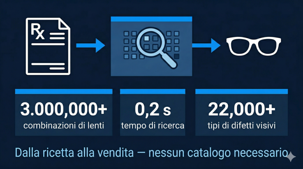 È un software che acquisisce i dati della ricetta e cerca automaticamente in un database di lenti disponibili per restituire opzioni corrispondenti — sostituendo le ricerche manuali sui cataloghi.