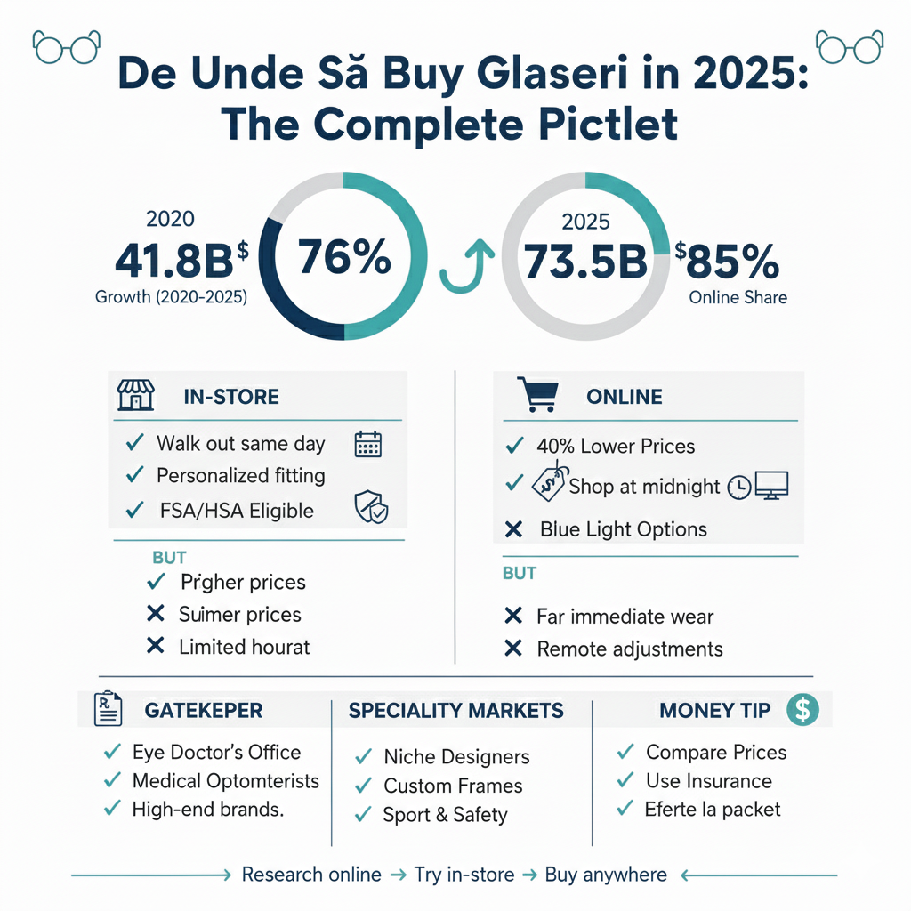 Dar comerțul cu amănuntul fizic nu dispare — evoluează. 85% din ochelarii de vedere sunt încă achiziționați personal, în ciuda creșterii masive a vânzărilor online. Această statistică nu este întâmplătoare; este preferința clienților care dezvăluie valoarea reală a îndrumării profesionale față în față.